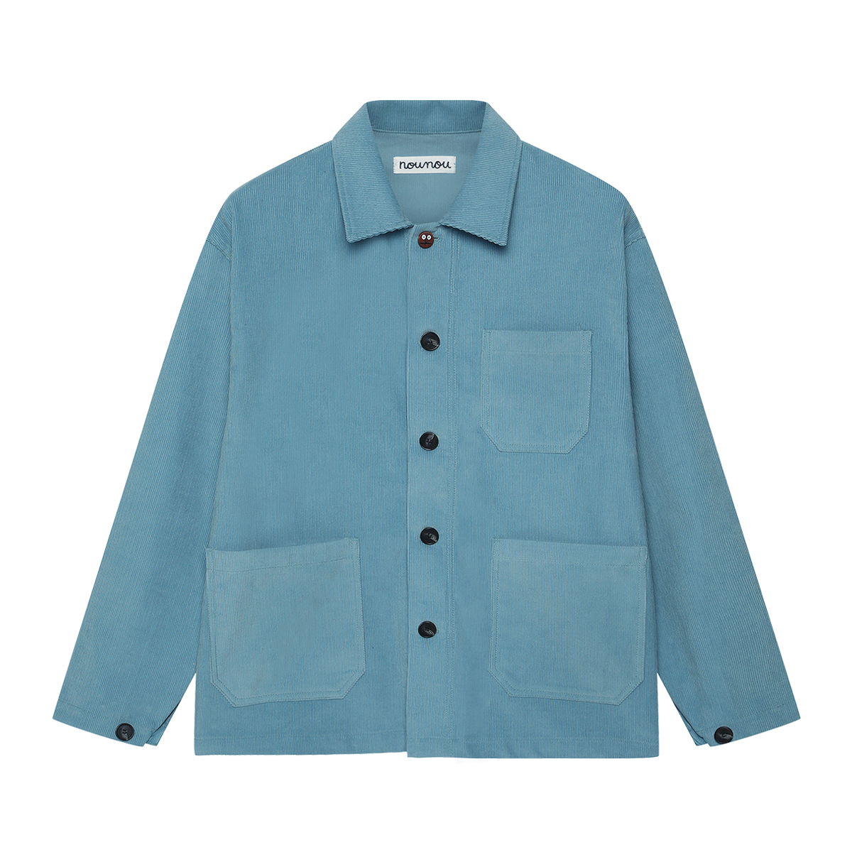 NouNou’s classic work jacket is reimagined in corduroy for the new season. Featuring a newly designed face-shaped top button, it’s finished with logo-engraved buttons for a refined touch. The back showcases NouNou’s signature face, embroidered in matching corduroy fabric. With its sturdy texture and medium weight, this piece can be worn as a stand-alone outer layer in autumn or layered as an inner jacket during winter.